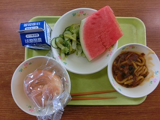 ひのくにパン、カレーうどん、グリーンサラダ、すいか、牛乳