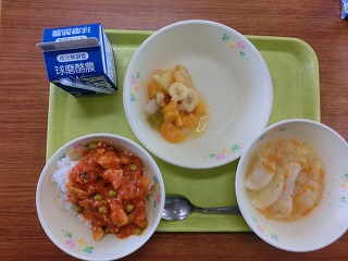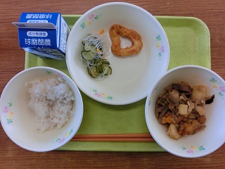 麦ごはん、ちくぜん煮、はるさめの酢の物、いかリングフライ、牛乳
