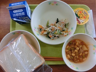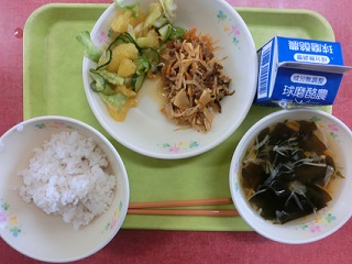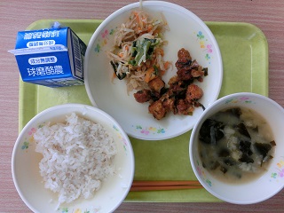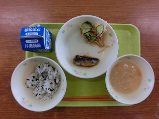 わかめごはん、トマト団子のスープ、ゆでもやし、いわしのおかか煮、牛乳