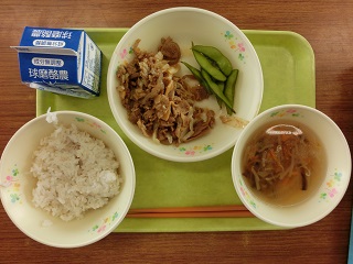 麦ごはん、ナムルスープ、枝豆の塩ゆで、焼肉、牛乳