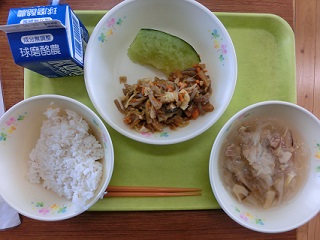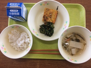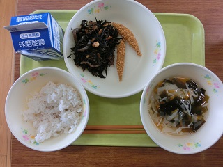 麦ごはん、きしめん汁、しそひじき和え、切り干し大根の卵焼き、牛乳