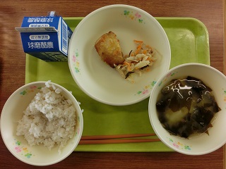 麦ごはん、魚そうめんのすましじる、大豆のいそ煮、きびなごフライ、牛乳