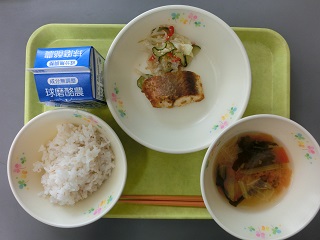 麦ご飯、レタスとトマトのスープ、彩り野菜のごま酢和え、ムニエル、牛乳