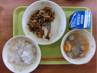 麦ごはん、とうがんのスープ、昆布とじゃこのきんぴら、ホキのニンニク焼き、牛乳
