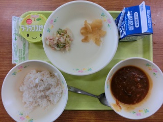 ハヤシライス、つぼ漬け、ツナサラダ、ラフランスゼリー、牛乳