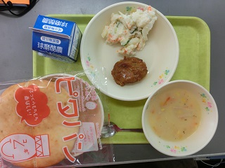 ピタパン、コーンスープ、ポテトサラダ、照り焼きチキン、牛乳