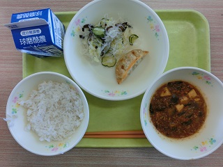 麦ごはん、マーボーナス、バンサンスー、ぎょうざ、牛乳