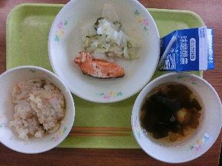 きのこごはん、すましじる、なしとキャベツのサラダ、鮭の塩焼き、牛乳