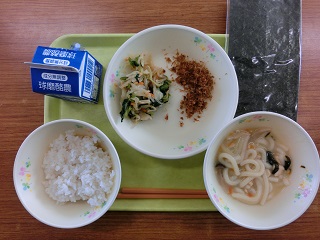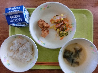 麦ごはん、じゃがいもと麩のみそ汁、五色あえ、鶏のからあげ、牛乳
