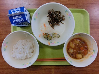 麦ごはん、トマト肉じゃが、春雨サラダ、いりこのつくだに、牛乳