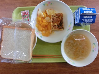 食パン、野菜スープ、チーズ入り手作りオムレツ、フルーツあえ、牛乳