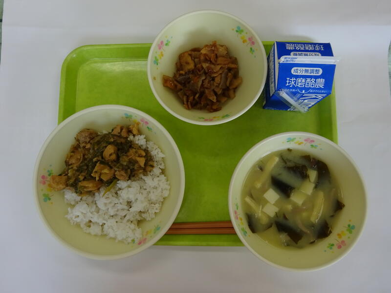「鶏肉のてり焼き丼・豆腐としめじのみそ汁・しょうが入りれんこんのきんぴら・牛乳」