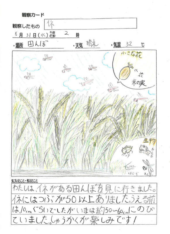5年生は成長する稲の様子をしっかりと観察しながら、収穫の日を心待ちにしているようです。