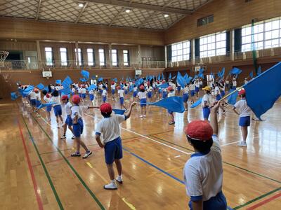 運動会の練習が始まって2週目、高学年の表現(フラッグ体操)の練習は順調に進んでいます。