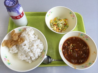 今日の給食はチキンライスが出ました。子どもたちの大好物です!