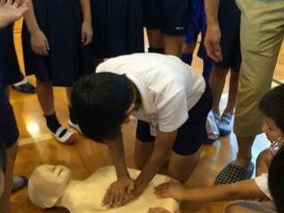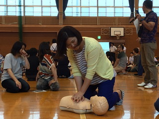 大人も子どもも一緒になって、心臓マッサージや事故の対応について消防署の方にお話を頂きました。