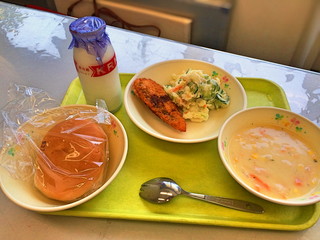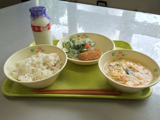 今日の給食はかき玉汁やカボチャのコロッケがでました!おいしかったですね!