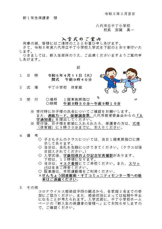 令和5年度 千丁小学校の入学式を予定どおり行います。