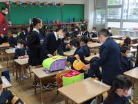 ※新しい学年のくつ箱にくつを入れます。3年生、5年生はくつ箱にはってあるクラス分けを見て新しい教室に入りましょう。2年生、4年生、6年生も新しい教室に入りましょう。