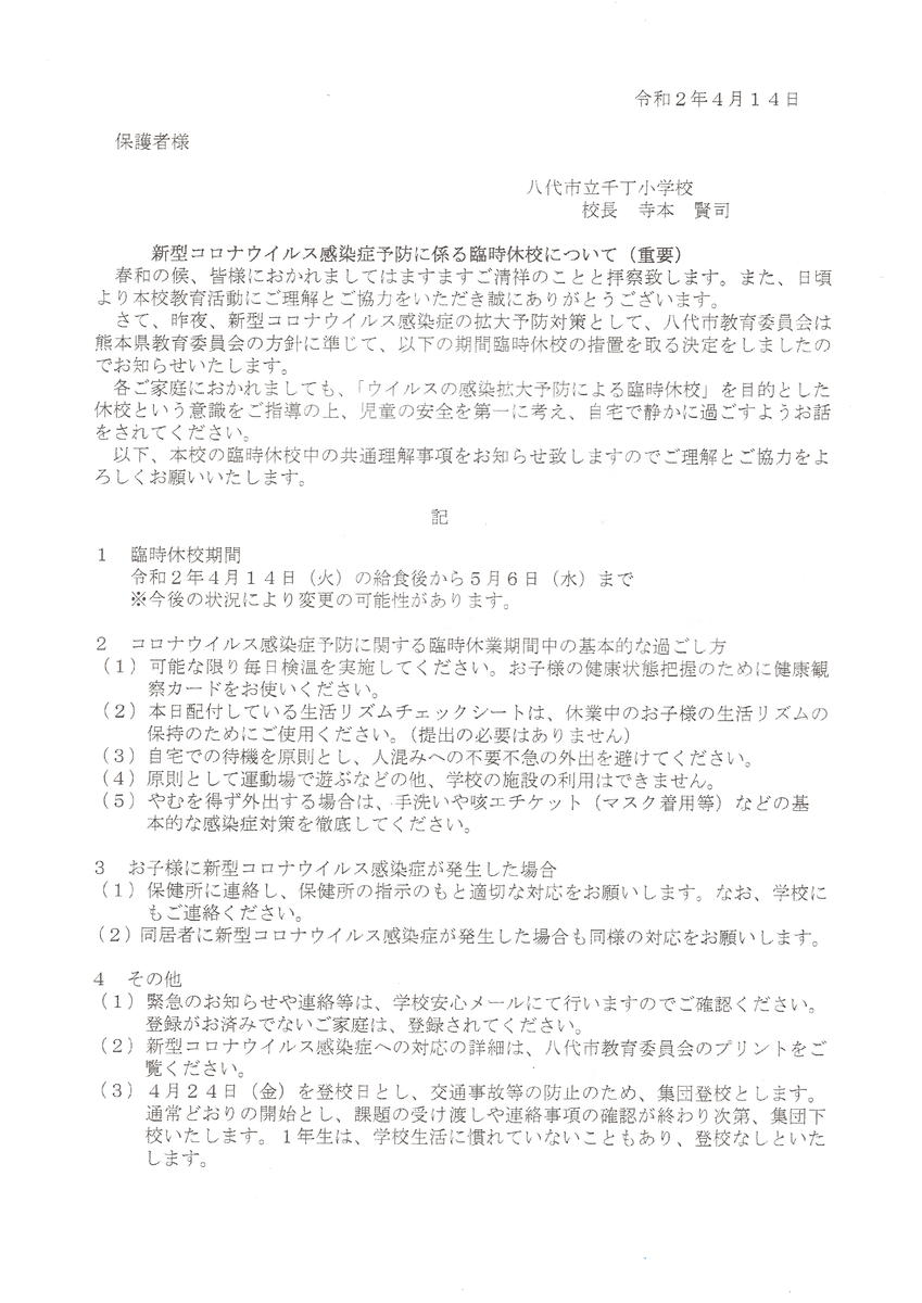 このことについて、八代市教育委員会からの文書を3通と千丁小学校からの文書を掲載しました。ご覧ください。