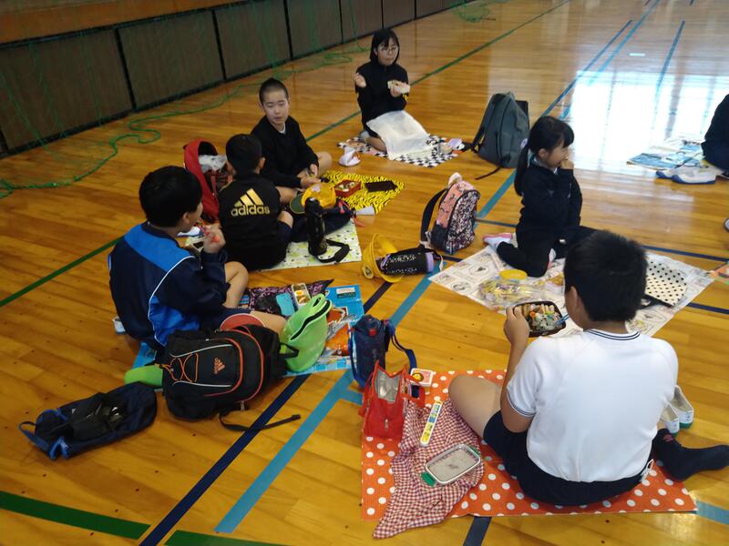 1年生は一緒に歩いてくれた6年生のお兄さん、お姉さんと一緒にお弁当を食べました!