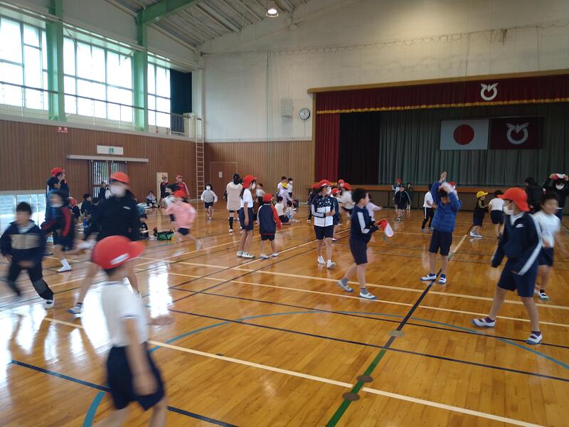 歓迎会の後はいよいよ出発。天気は大丈夫かな、と前日から検討に検討を重ねて判断し、目的地の麟泉公園に向かいました。しかし、途中でパラパラと雨が・・・。急遽、目的地を変更し、コミセンの体育館を利用しました。