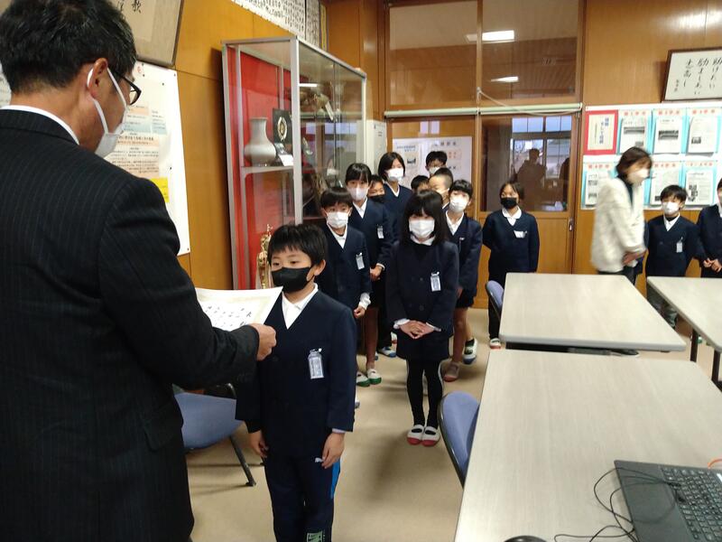 12月22日(木)の朝自習の時間、持久走大会の表彰を行いました。各学年、男女1位(新記録も含む)、宣言タイム1位(宣言タイムと実際のタイムの誤差)の子どもたちを校長室で表彰し、その様子をリモートで各教室に流しました。