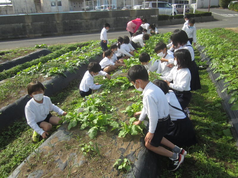 保護者の方々や先生がいもをふかしている間に、大根の間引き おおきくなあれ!