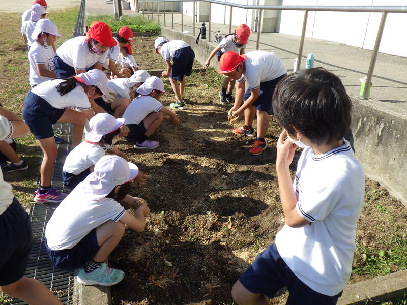 作っていたぼかしが十分に発酵しましたので、運動場の学級園や役場前の農園にまきました。これで畑の栄養はバッチリ。この後、冬野菜の種や苗を植えていきます。畑の栄養をたくさんとって、おいしくて大きい野菜ができることを願っています。