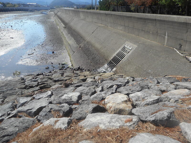 まずは、学校を出発して、志岐川の観察。洪水を防ぐ工夫や曲がったところの外側・内側の土地のつくりを見学しました。