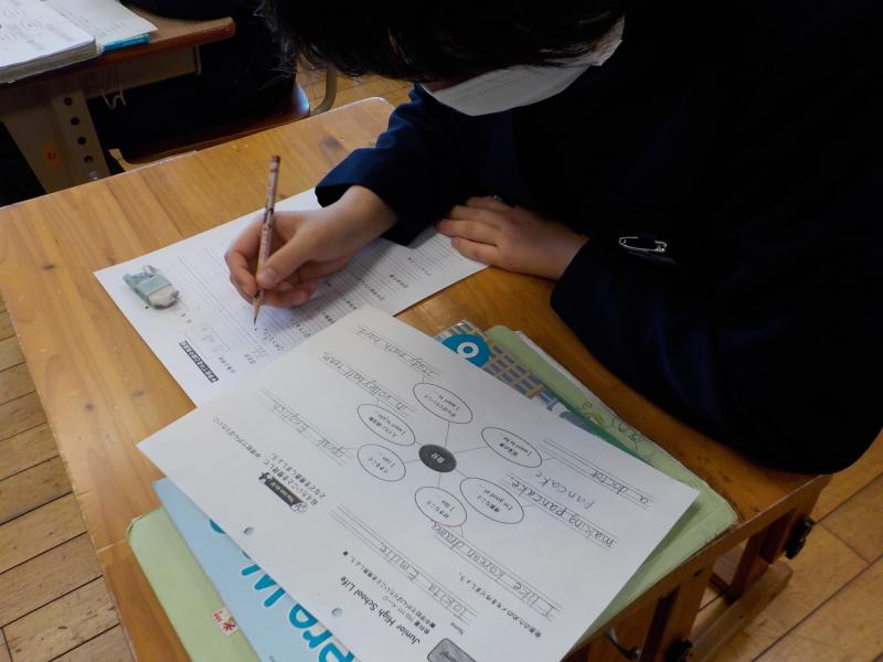 子どもたちは、事前に「中学校でがんばりたいこと」を書いていましたので、それを英文に変換。困ったときは3人の先生方にアドバイスをいただき、なんとか書き上げました。出来上がった原稿は、桑畑先生が預かってくださいました。