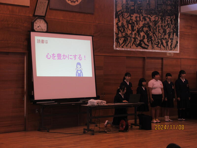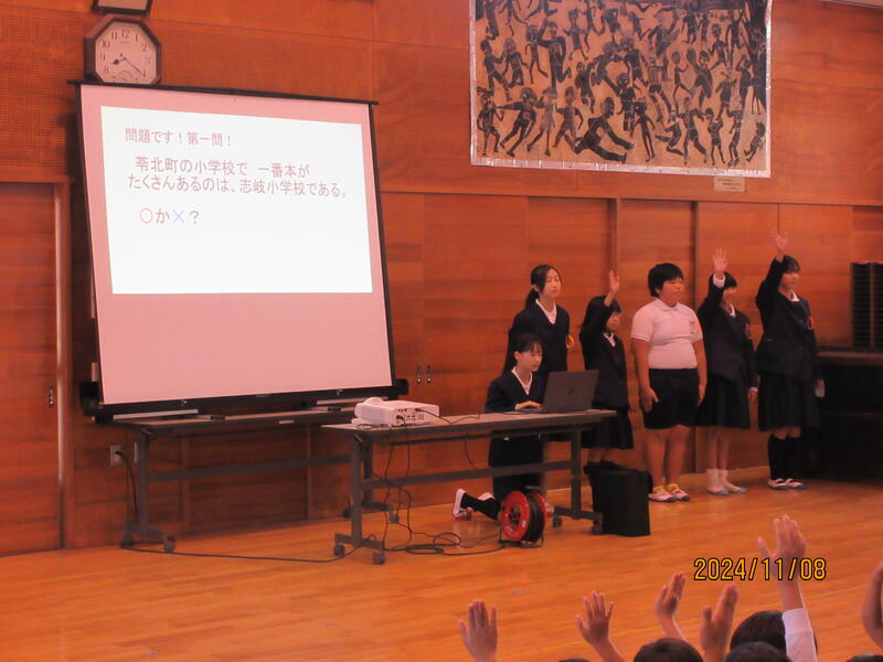 11月8日(金)、児童集会を行いました。今回は、図書委員会の発表でした。