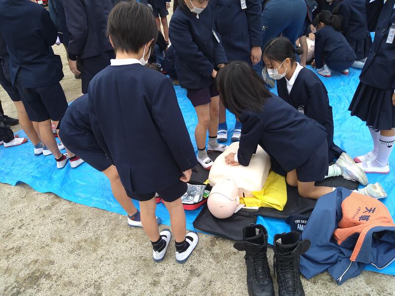救出、消火訓練が終わると、子どもたちは、救急教室で心肺蘇生法を学んだり、