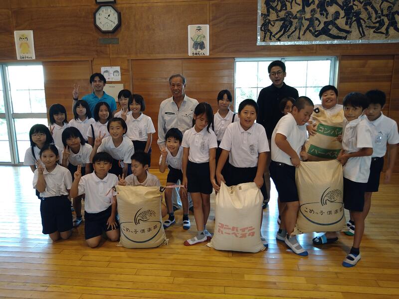 この米作りは、苓北町土地改良区の方々の取組です。本校と富岡小学校の5年児童が協力して田植え、稲刈りを行いました。そして、そこで収穫したうるち米ともち米2袋ずつをいただきました。
