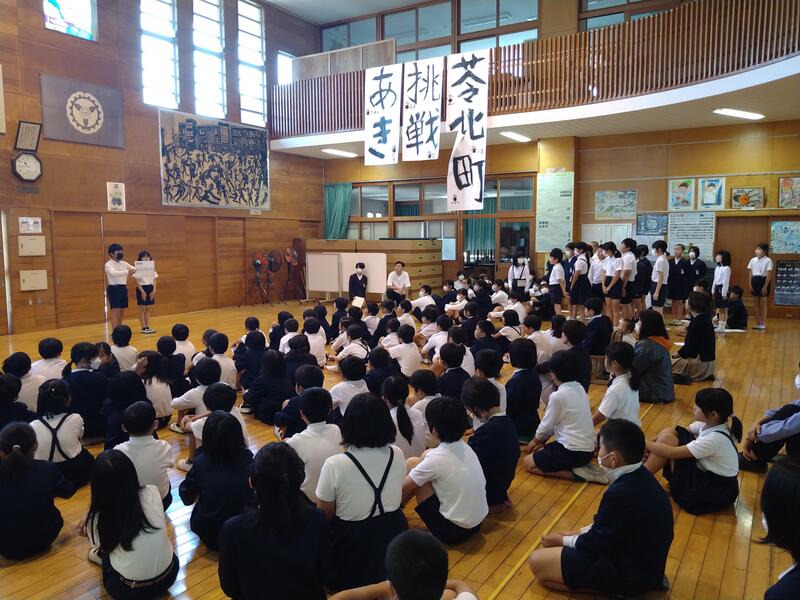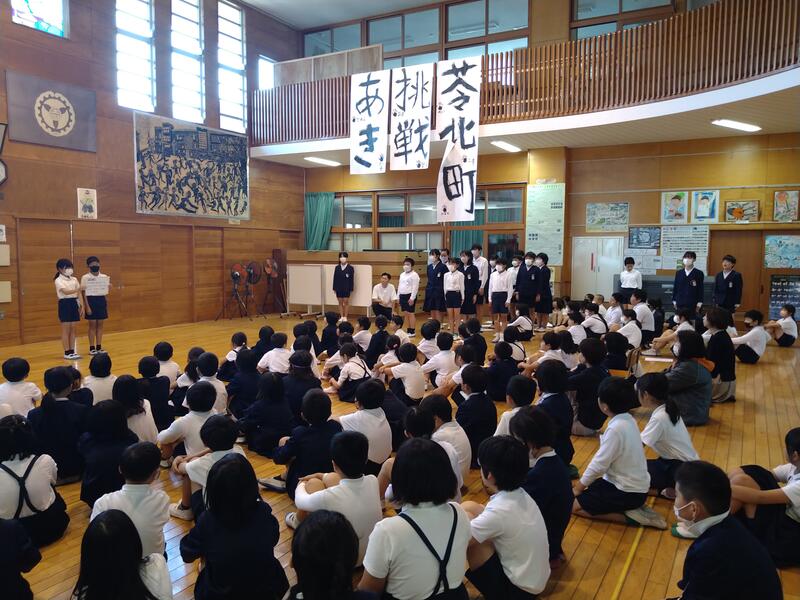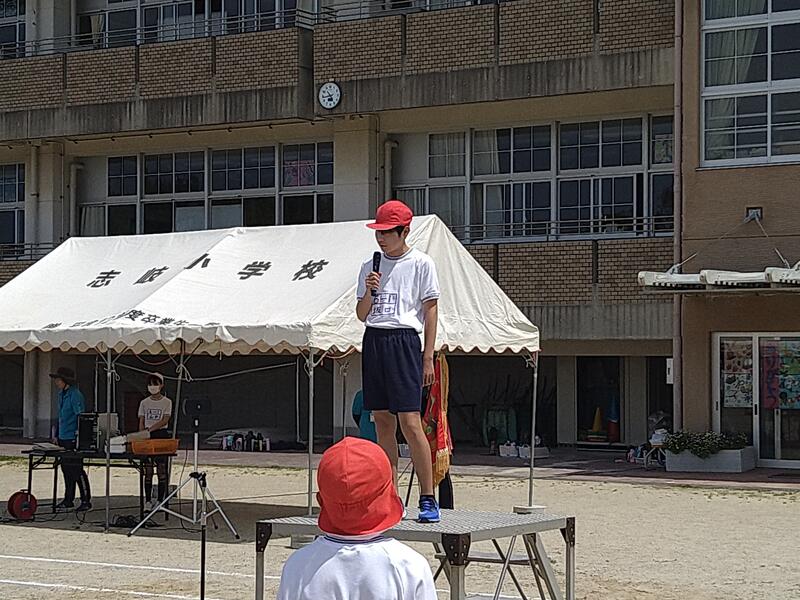 次に、児童会で話し合って決定した、運動会のスローガンの発表がありました。