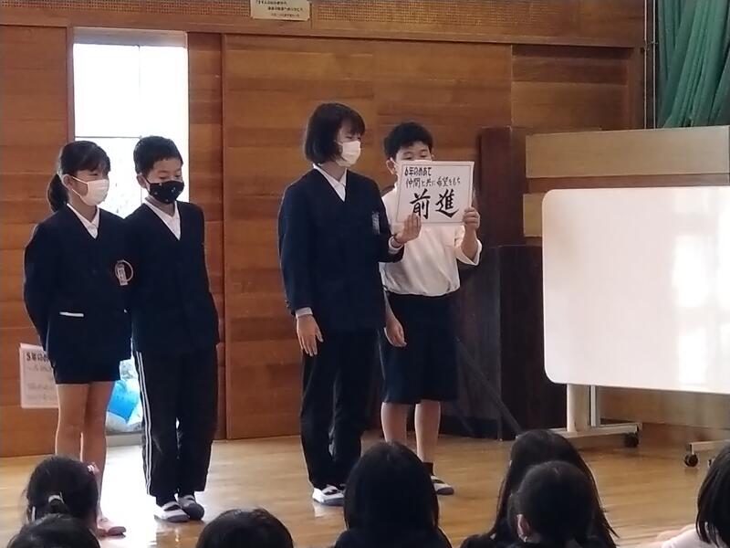 まずは、各学級のふり返り。年度当初に立てた学級のめあてにそって、代表児童がふり返りを発表しました。