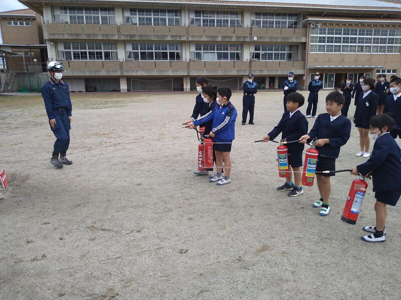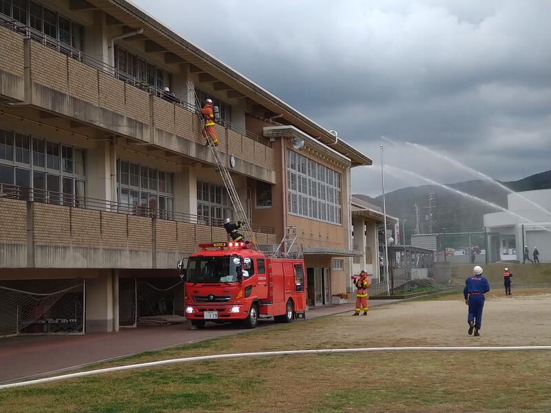 11月12日(日)、町の防災訓練が行われました。コロナ禍で中止になっていましたが、今年度から再開され、本年度は志岐地区で行われることとなりました。地震が発生したため運動場に避難。その後、1階の給湯室から火災が発生し、消火を行うという想定でした。