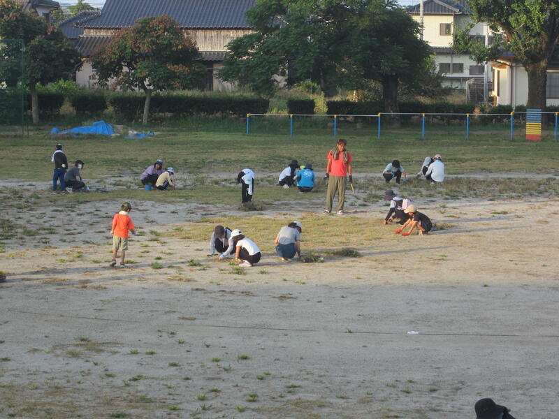 3年生以外の保護者や子どもたちは、運動場のトラックやフィールドを中心に草抜き