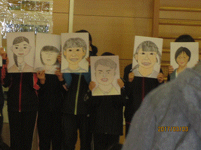3月3日(金)、6年生を送る会が行われました。6年間、志岐小のために頑張ってくれた6年生のために、5年生を中心にいろいろなプレゼントが贈られました。写真は「わたしは誰でしょうクイズ」です。6年生になりきった5年生がいろいろなヒントを出しながらクイズを出しました。描いた似顔絵は、最後に6年生に贈りました。