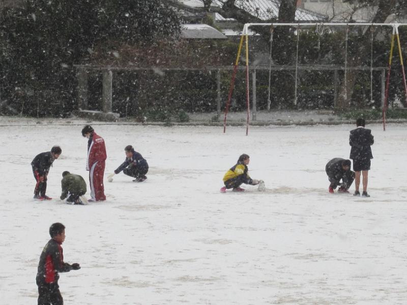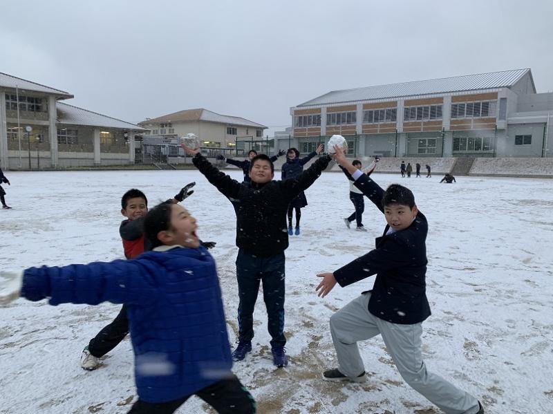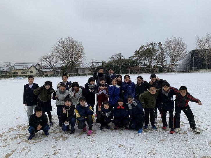 1月8日(金)、3学期が始まって2日目。天草にも寒波がやってきて、朝から雪が降ってきました。登校中はそうでもなかったのですが、子どもたちが登校して学校に着いたころから雪が降り始め、朝自習の時間には、運動場にうっすらと雪が積もった状態になりました。