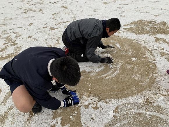 甲子園の土集め、ではなく運動場の雪集め もはや、何のまねなのか分かりません