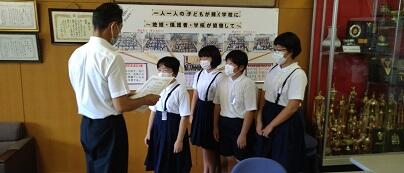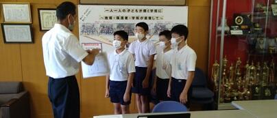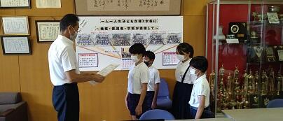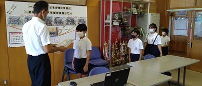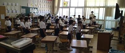 次は、いつもだったら「校歌斉唱」ですが、このまん延防止措置の期間は合唱や鍵盤ハーモニカ、リコーダー演奏は控えることになっていますので、代わりに「校歌清聴」。