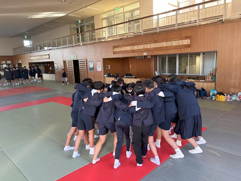 会場に到着したら、武道場で発声練習 円陣を組んで、気合いも入れ直しました!