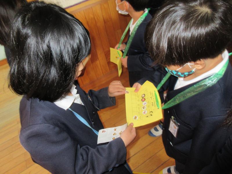 探検した場所はシールでチェック。1年生のカードに2年生が貼ってあげました。