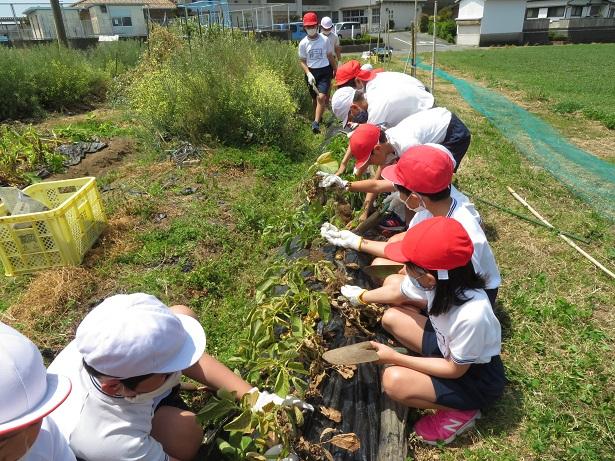 昨年度、総合的な学習の時間にジャガイモの種芋を植えました。それが立派に成長し、いよいよ収穫の時期になりました。そこで、4月22日(木)、4年生がジャガイモ掘りを行いました。