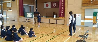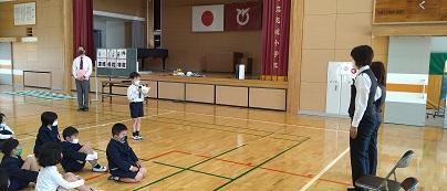 まずは、1~3年生の講話。横断歩道の渡り方を中心にお話をしていただきました。