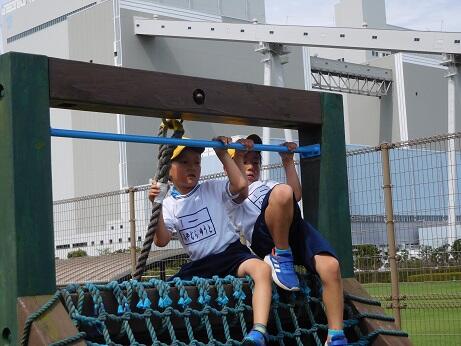 まず、13日(火)は公園での遊具を使っての学習。学校にはない、公園にある様々な遊具を使って、楽しく活動しました。