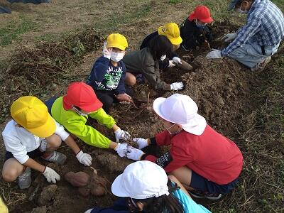 6月に植えたいものつるが大きく育ち、いよいよ収穫の時期となりました。立山先生のご指導の下、地域の平野さんご夫婦にも協力をいただき、楽しくいもをほることができました。