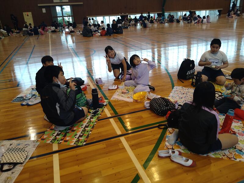 1年生は一緒に歩いてくれた6年生のお兄さん、お姉さんと一緒にお弁当を食べました!