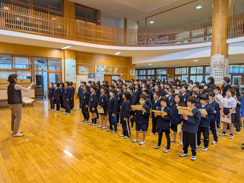 音楽主任の指導の下、「さようなら」の歌唱練習 4年生の半数と5年生は、アルトパートを歌います
